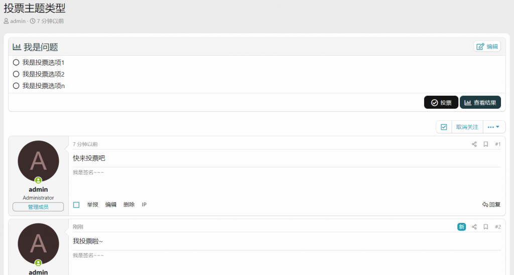 能发帖,该类型板块带四种主题类型,分别是 讨论 文章 投票 问答2.1 讨论